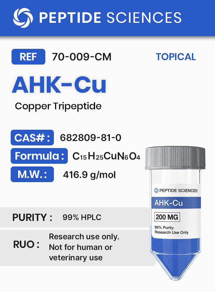 AHK-Cu is a short tripeptide (alanine-histidine-lysine) complexed with a copper ion. The copper atom is coordinated through nitrogen-containing residues within the peptide, forming a stable metallopeptide structure. In laboratory research, AHK-Cu is studied for its interaction with cellular pathways involved in extracellular matrix regulation, endothelial cell signaling, and growth factor modulation.