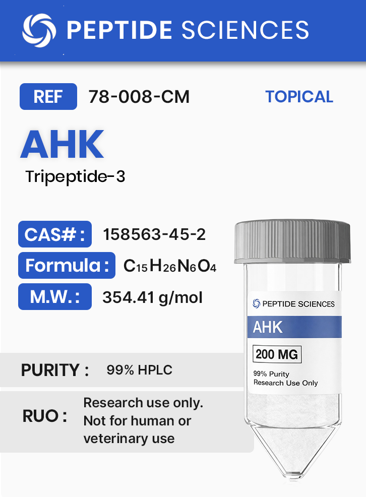 AHK (Tripeptide-3) is a synthetic tripeptide composed of the amino acids alanine, histidine, and lysine (Ala-His-Lys). AHK tripeptide research investigates its interaction with cellular pathways involved in extracellular matrix regulation, angiogenesis-associated signaling, and tissue remodeling processes. In laboratory studies, AHK is frequently examined alone or in copper-complexed form (AHK-Cu) to evaluate how short peptides influence fibroblast and endothelial cell activity under controlled conditions.