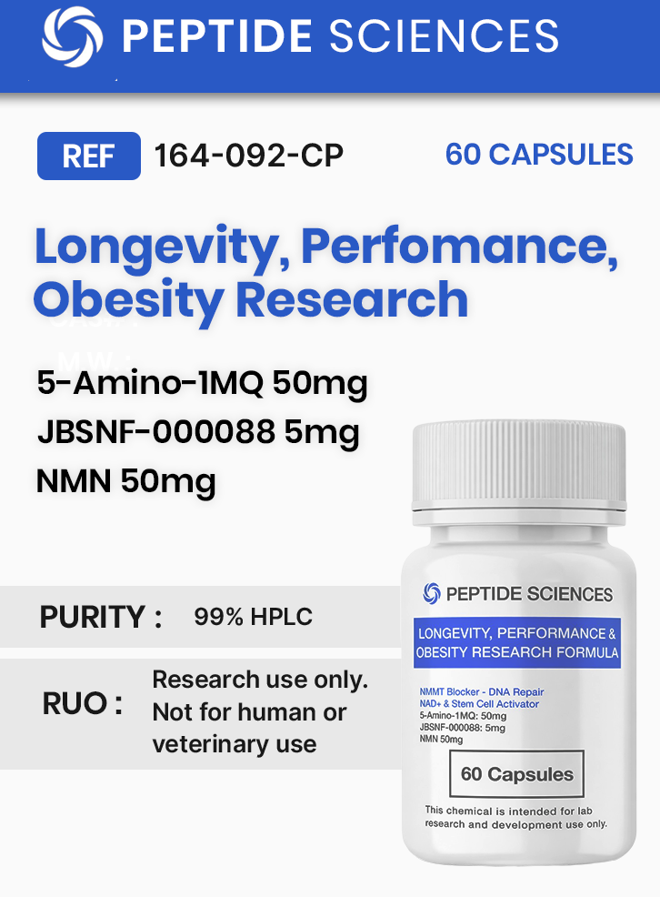 Longevity, Performance & Obesity Research is a research peptide formulation developed to investigate metabolic regulation, mitochondrial function, and nutrient-sensing pathways. Preclinical studies indicate that its components modulate AMPK activation, sirtuin signaling, and oxidative stress response, supporting models of cellular energy balance and redox regulation. This formulation is utilized in experimental research focused on longevity signaling, performance metabolism, and molecular mechanisms of energy efficiency.