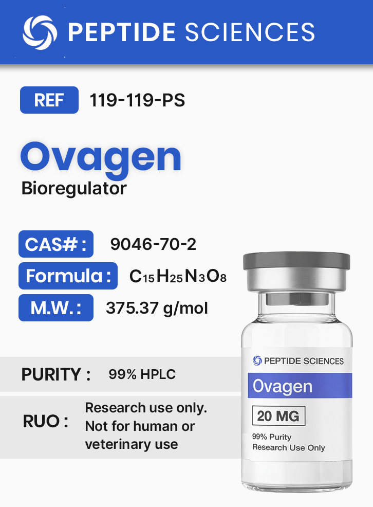 Ovagen is supplied exclusively for laboratory research use. Reported research applications include in-vitro and in-vivo experimental designs examining peptide-mediated regulation of hepatic and gastrointestinal cellular systems. Typical use cases include: (i) studies of transcriptional regulation and chromatin accessibility in liver-derived cells; (ii) evaluation of extracellular matrix and fibrotic-marker expression in animal models; (iii) gastrointestinal epithelial barrier and mucosal signaling assays; and (iv) enzymatic interaction studies in virological or biochemical assay systems where peptide–enzyme binding is investigated under controlled conditions.