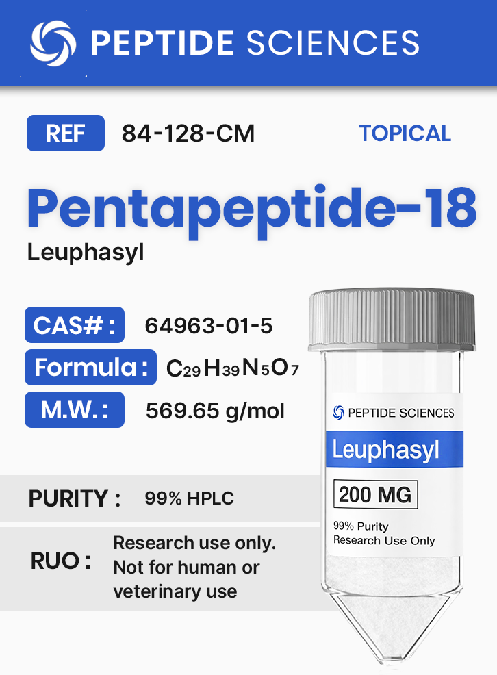 Pentapeptide-18 (Leuphasyl) is a synthetic pentapeptide supplied exclusively for laboratory research applications. The peptide is derived from enkephalin-related sequences and is investigated in preclinical and in vitro experimental systems for its interaction with neuromuscular signaling pathways. Research focuses on characterization of peptide-mediated modulation of synaptic communication under controlled laboratory conditions.