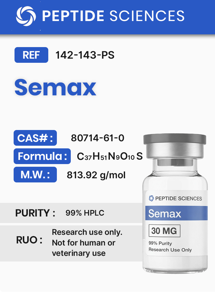 Semax is a synthetic analogue of an ACTH fragment, corresponding to amino acids 4–10 of ACTH with a C-terminal Pro-Gly-Pro motif. In laboratory research, Semax is used in preclinical models to probe pathway-level regulation of: