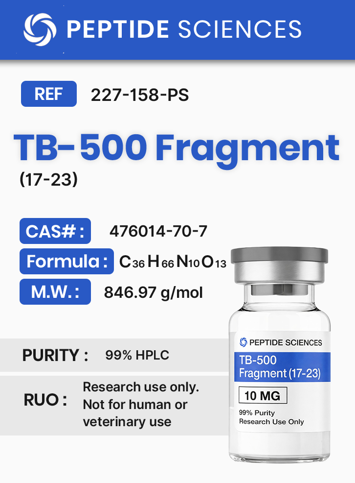 TB-500 Fragment (17-23) is a research peptide consisting of a short amino acid sequence derived from the actin-binding region of Thymosin Beta-4. It has been shown in preclinical studies to regulate cell migration, angiogenesis, and cytoskeletal organization through modulation of actin polymerization. This fragment is used in experimental research investigating wound repair, tissue remodeling, and peptide-mediated regenerative signaling mechanisms.