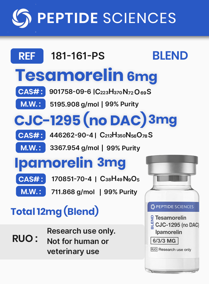 Tesamorelin, CJC-1295 (no DAC), and Ipamorelin is a research peptide blend formulated to investigate growth hormone axis modulation through combined GHRH and ghrelin receptor pathways. Tesamorelin and CJC-1295 (Mod GRF 1–29) activate GHRH receptor signaling via cAMP/PKA cascades, while Ipamorelin targets the GHS-R1a receptor, promoting calcium mobilization. This blend is used in endocrine and receptor biology studies exploring synergistic GH pulsatility and hypothalamic–pituitary coordination.