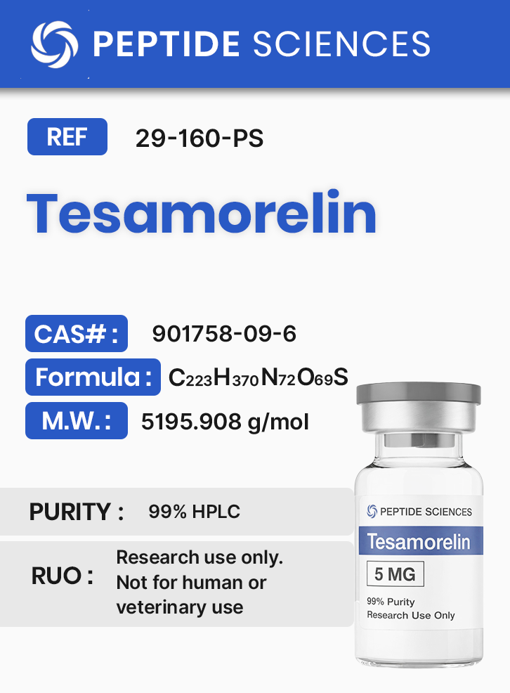 Tesamorelin is a growth hormone releasing hormone analog that has been shown to increase IGF-1 levels in men by an average of 181 micrograms/liter. It binds and stimulates human GHRH receptors with similar potency as endogenous GHRH. It has a host of other benefits including nootropic effects and reducing triglycerides. Tesamorelin research has subsequently been shown to decrease carotid intima media thickness (cIMT), visceral adipose tissue (VAT), and C-reactive proteins (CRP) in a recent study. It has not been shown to significantly affect other pituitary hormones and their respective mechanisms in the body. Additionally, studies have shown it to improve cognitive function for healthy older adults and also for people with mild cognitive impairment who are at an increased risk of progressing to Alzheimer’s disease.